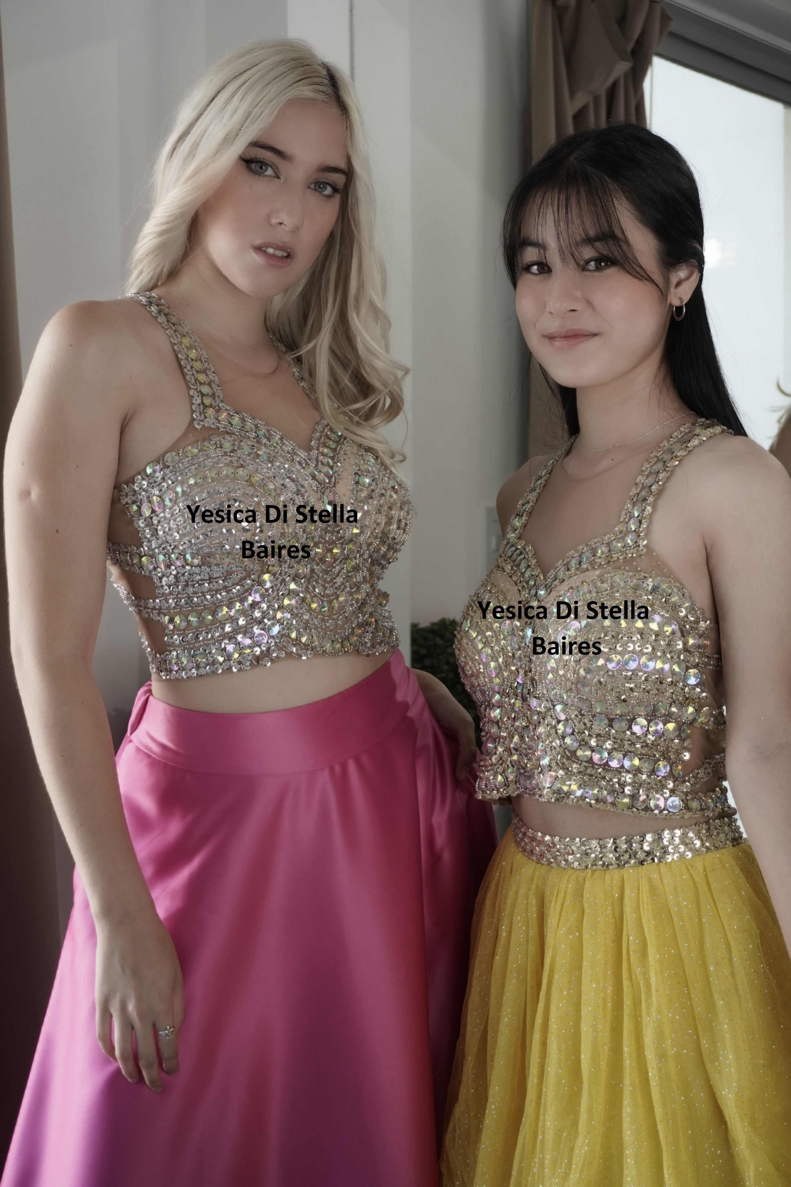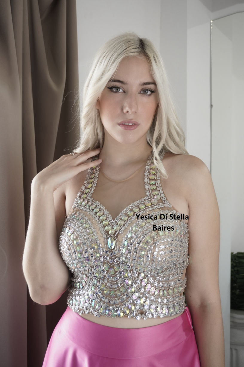 Tul bordado en piedras, lentejuelas y mostacillas. Espalda corset regulable.