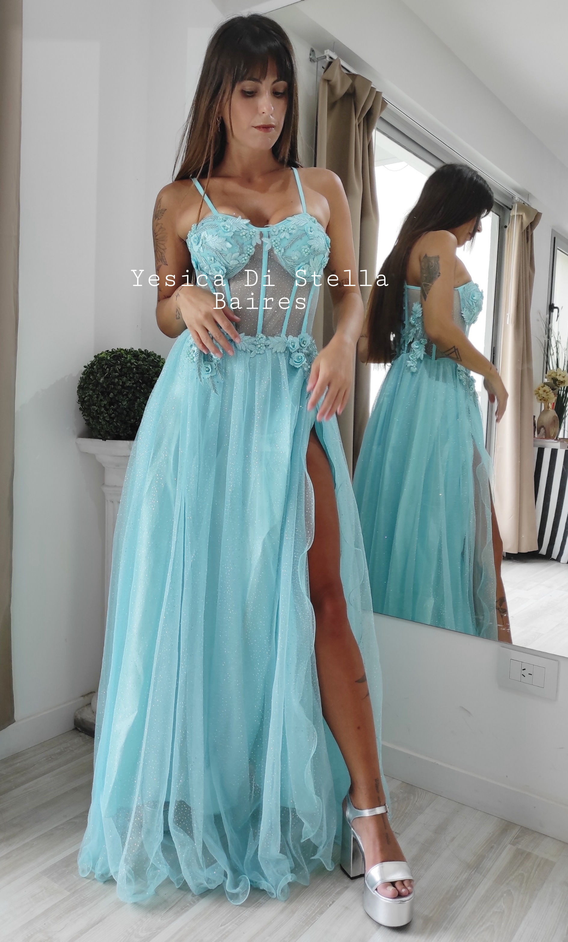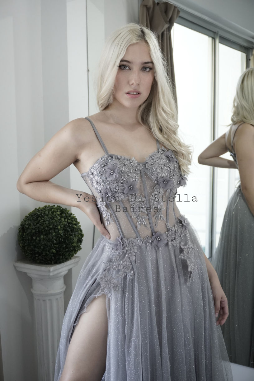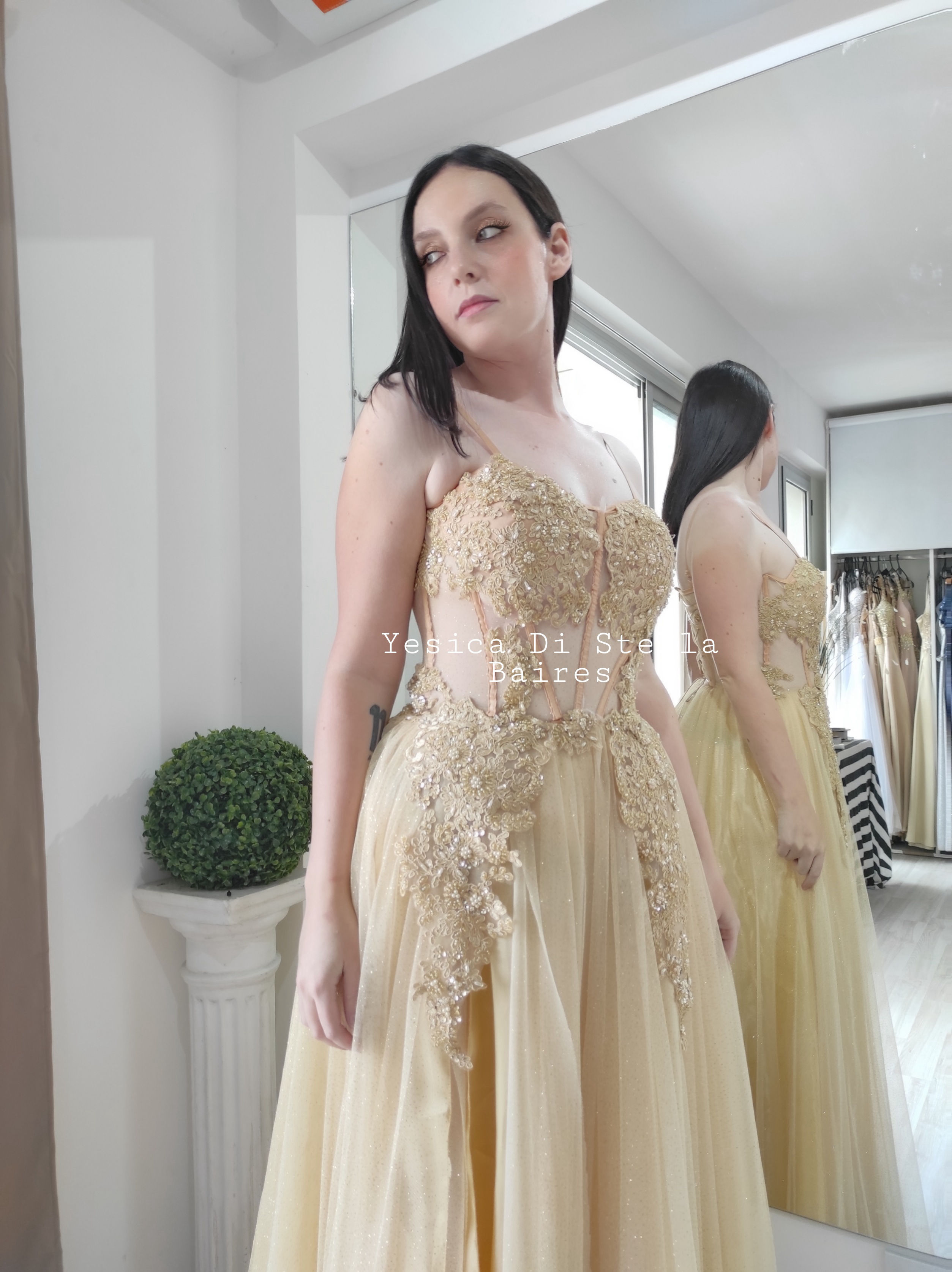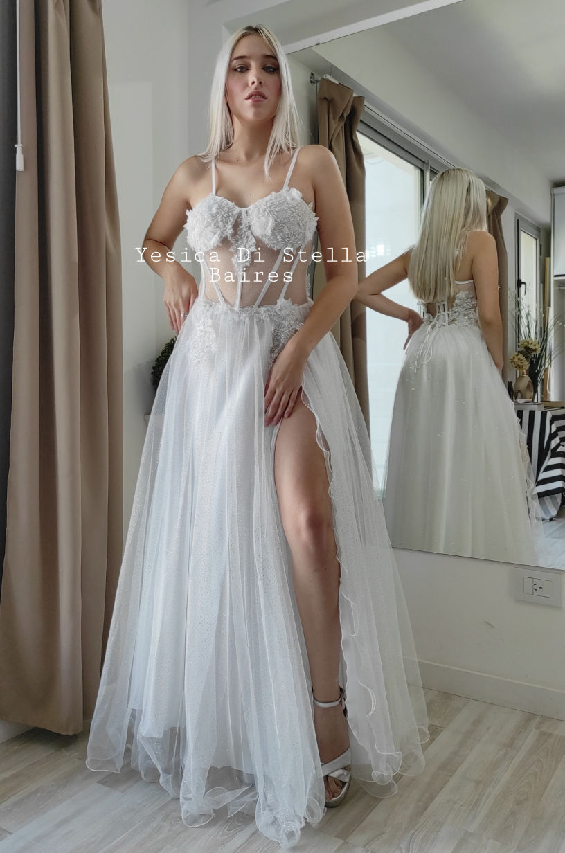 Tul bordado en guipiur. Pechera con ballenas corset regulable.