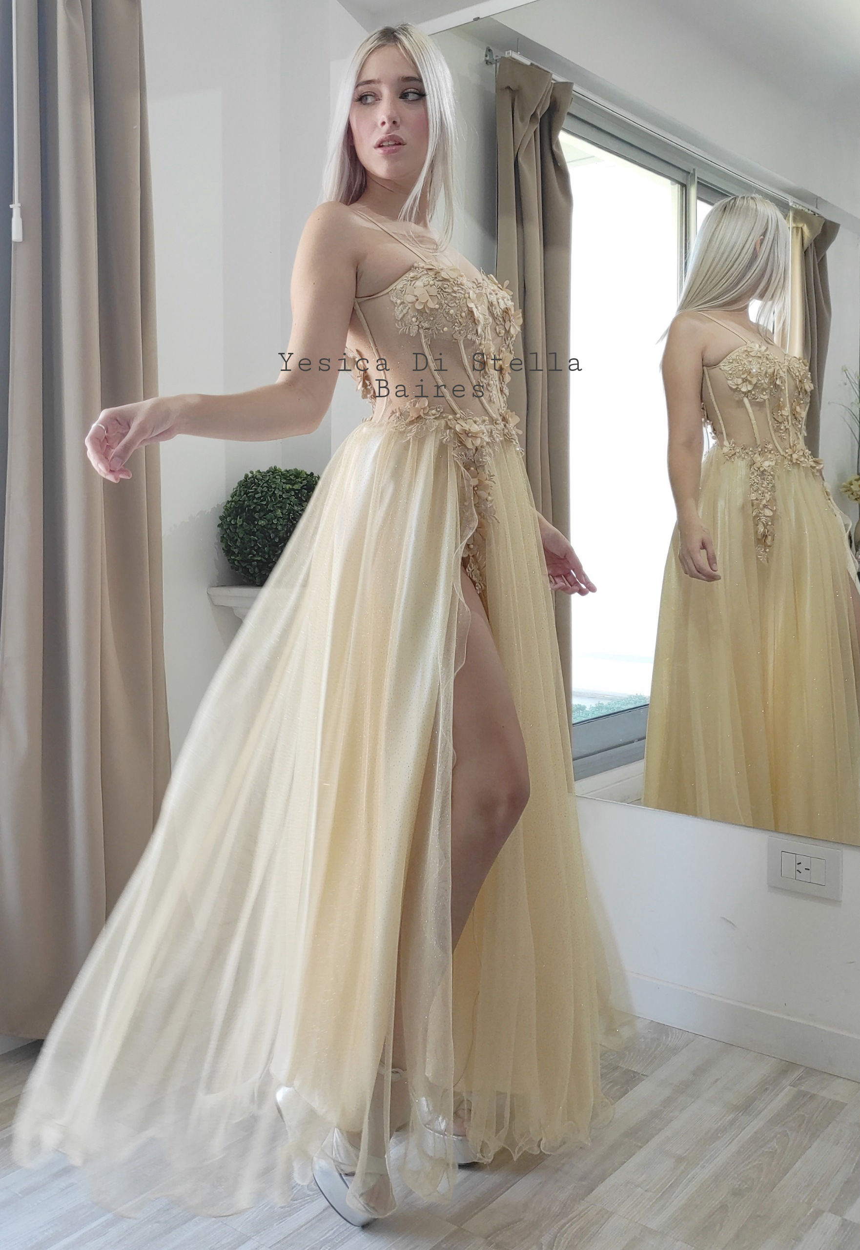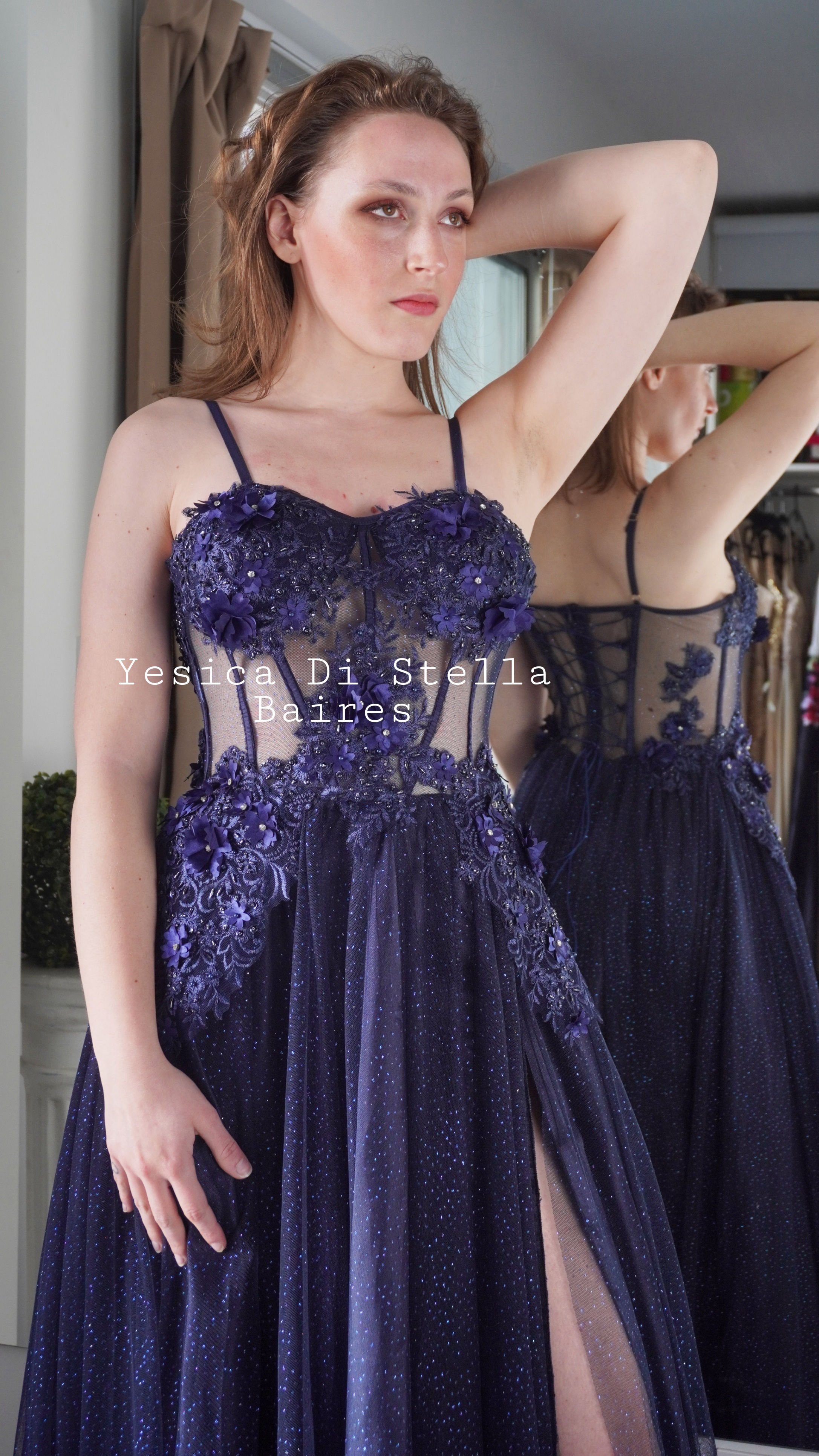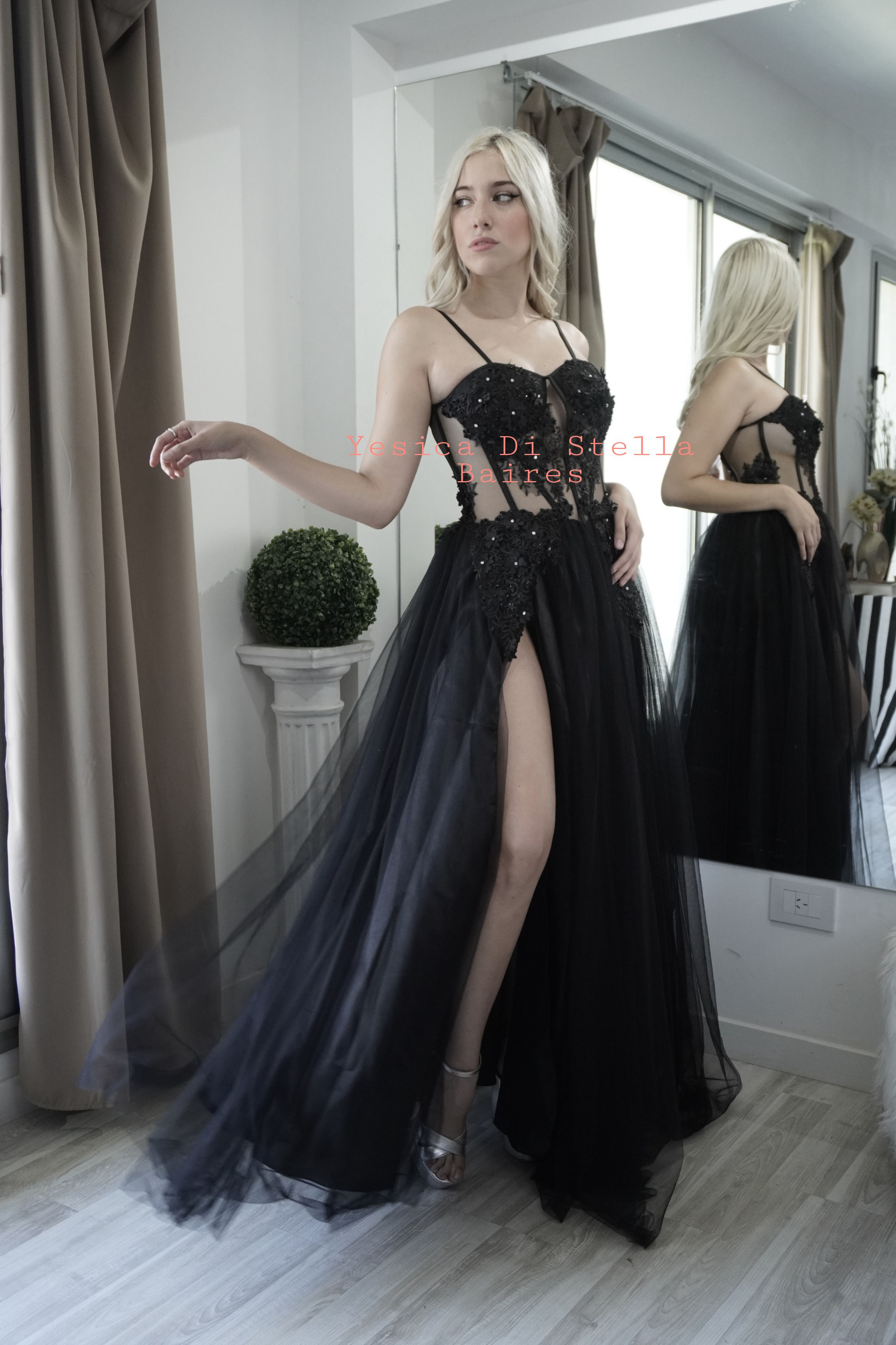 Tul bordado en guipiur. Pechera con ballenas corset regulable.