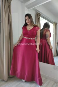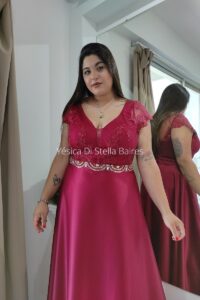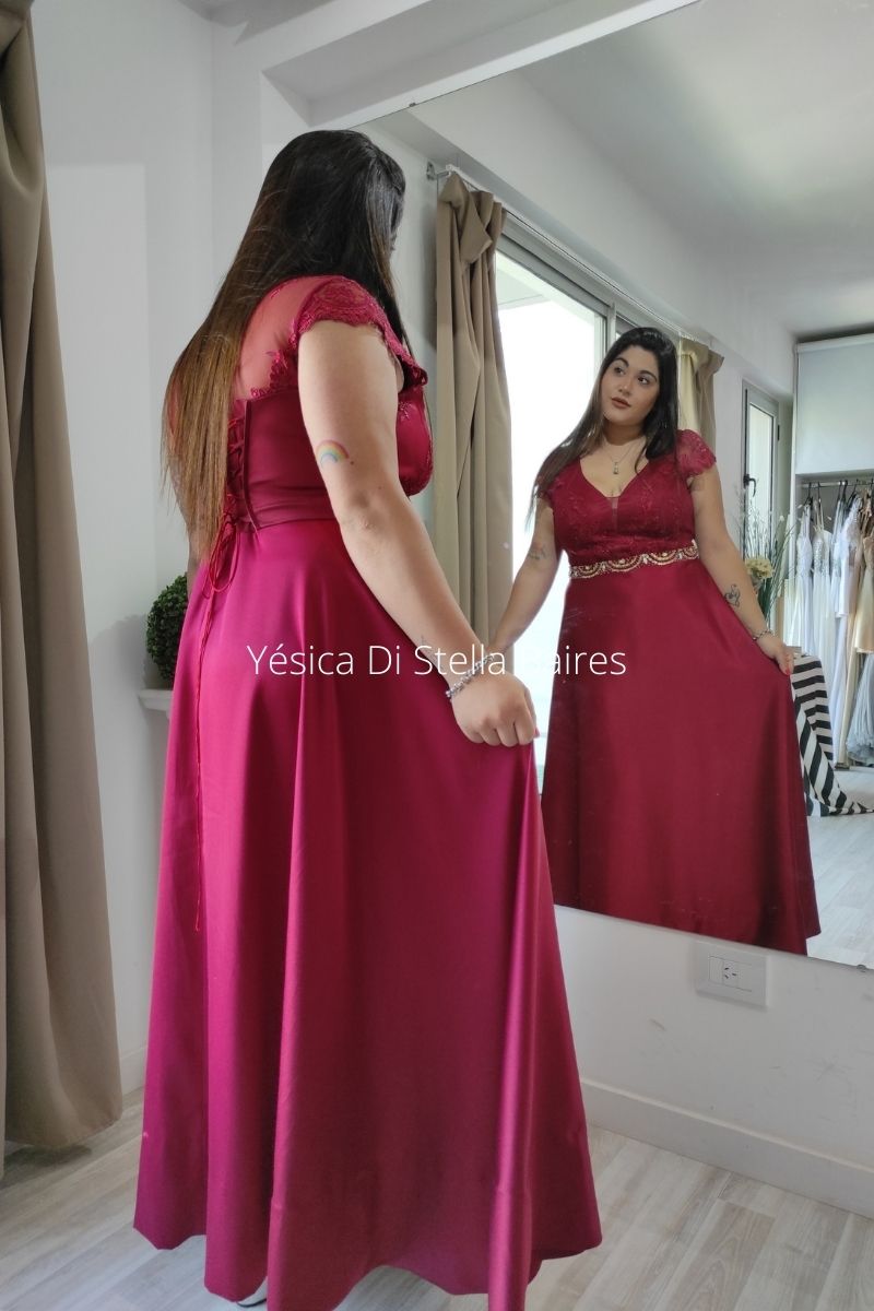 Raso. Pechera bordada en guipiur. Cinto bordado en lentejuelas y piedras. Espalda corset regulable. Abertura.