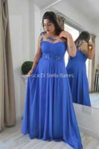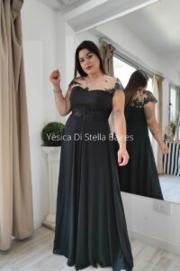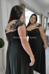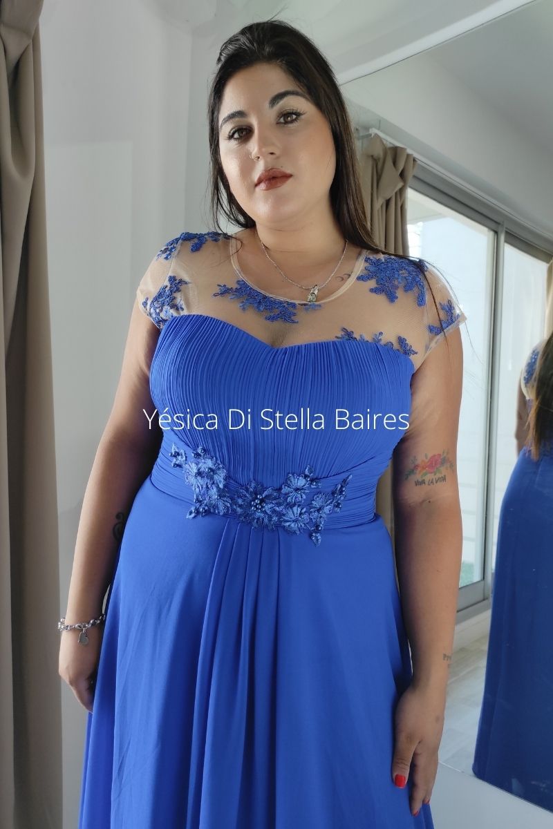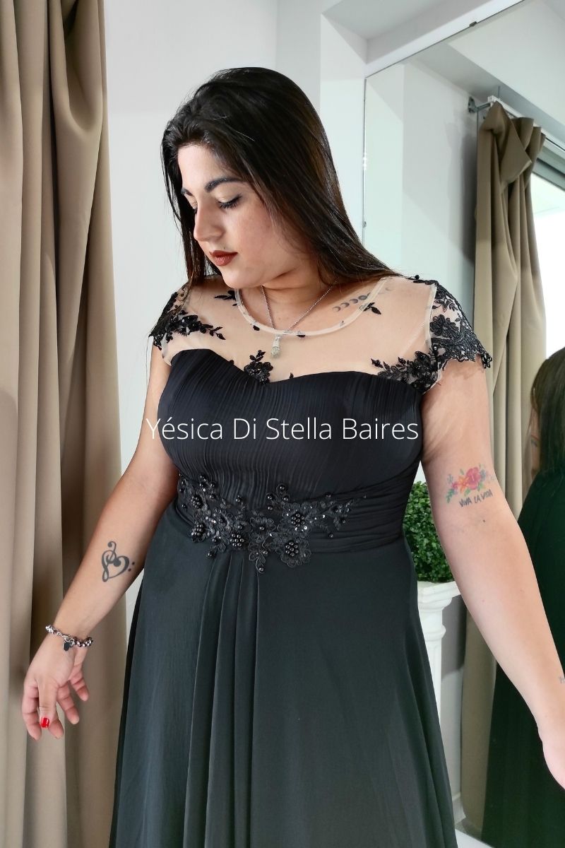 Gasa. Pechera bordada en guipiur. Espalda corset regulable. Abertura.