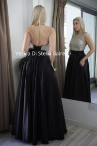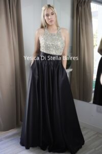 Pechera bordado en lentejuelas y mostacillas. Raso. Espalda corset permite ajustarse a varios talles.