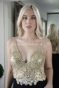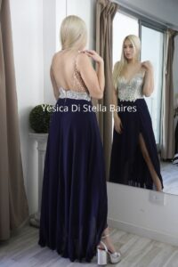 Tul bordado en piedras y mostacillas, gasa con fondo y tajo.